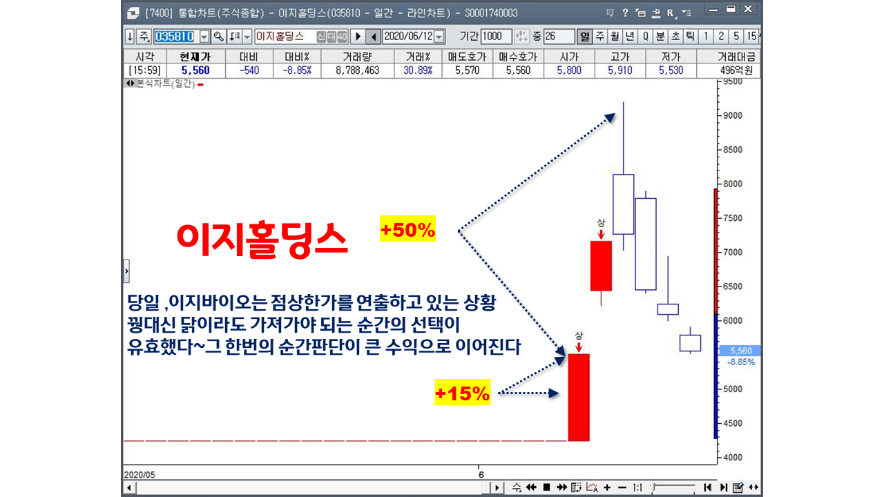 이지홀딩스! 분할상장 이슈가 있는 당일에 이지바이오 의 강력한 점상한가에 힘입어 상한가를 가게 되는데 , 이지바이오의 점상물량을 받기는 무리라고 판단한 우리든 꿩대신 닭이라고! 이지홀딩스를 공략하게 되고 당일 +15%수익을 챙기고 상매매로 상한가로 보유하면서 담날로 넘어가게 된다! 그 이후 비록 이지바이오와 호흡을 끝까지 맞추지는 못했지만 , 우리에겐 충분한 수익을 안겨준! 추종주매매의 진수를 보여준 효자종목이기도 하다. 비록 짧은 기간의 급등세였지만 그 기세의 훌륭함에 박수를 보내고 싶다! 수고했다 이지홀딩스!