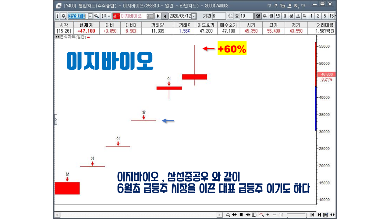 6월초 급등주 시장에서 엄지를 치켜세워줄 종목을 꼽으라면 , 삼성중공우 와 더불어서 이지바이오를 말하지 않을수는 없을것이다.